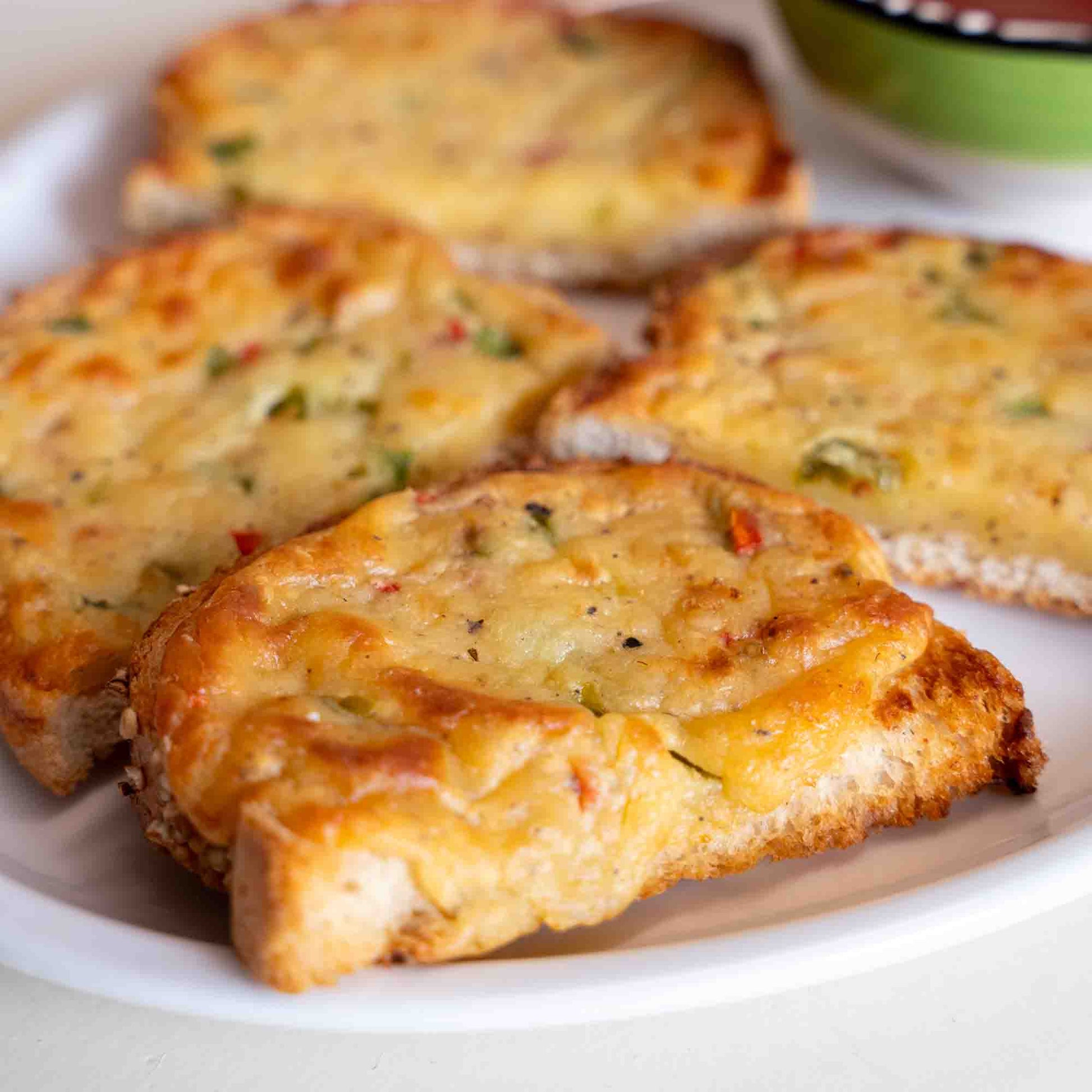 A hearty slice of whole wheat bread generously topped with a savory blend of cheese and eggs, finished with aromatic herbs for a deliciously satisfying bite.